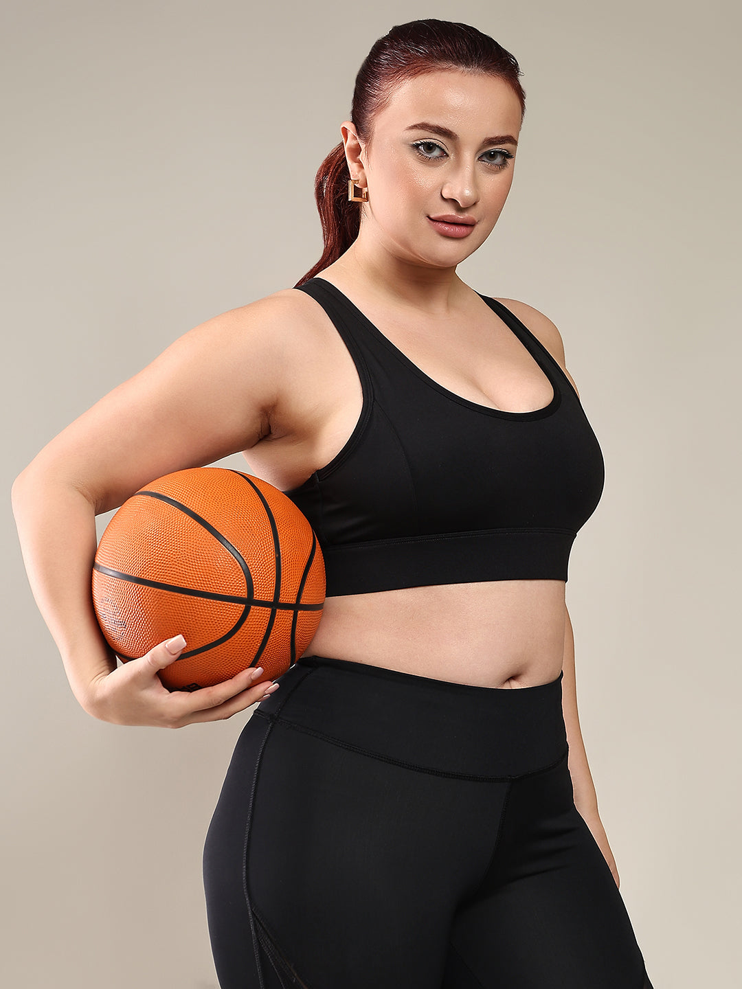Brachy Black Solid Women Plus Size Full Coverage Padded Rapid-Dry High Impact Racerback Workout Bra.