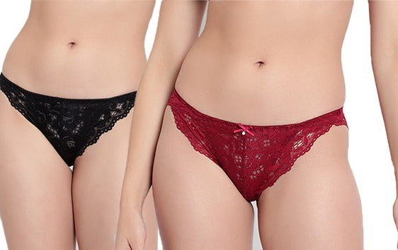 Set Of 2 Black & Maroon Mid-Rise Net Self Design Panties Bikini Briefs