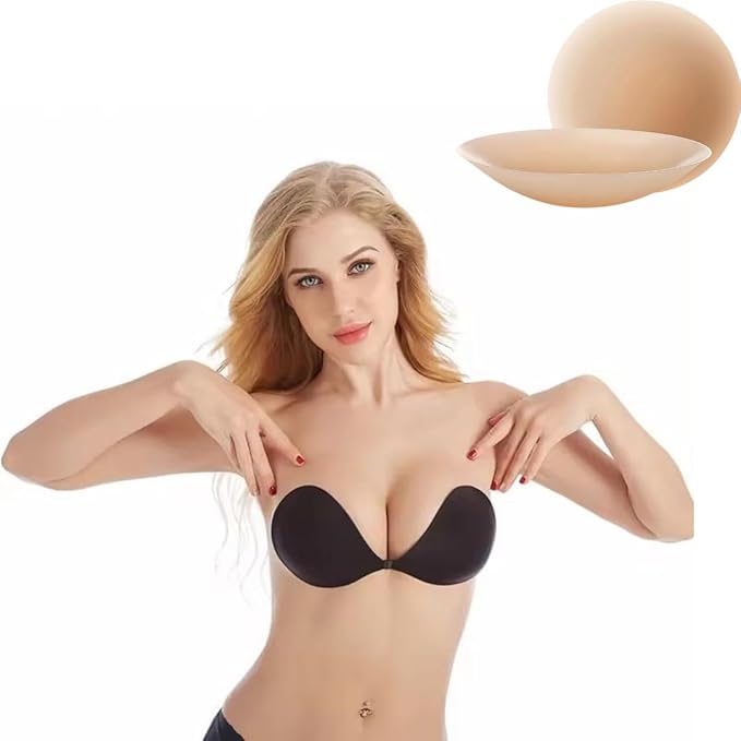 Women Black Strapless Sticky Bra Invisible Backless Stick on Push up Lift Bra With Reusable Silicone Nipple Covers