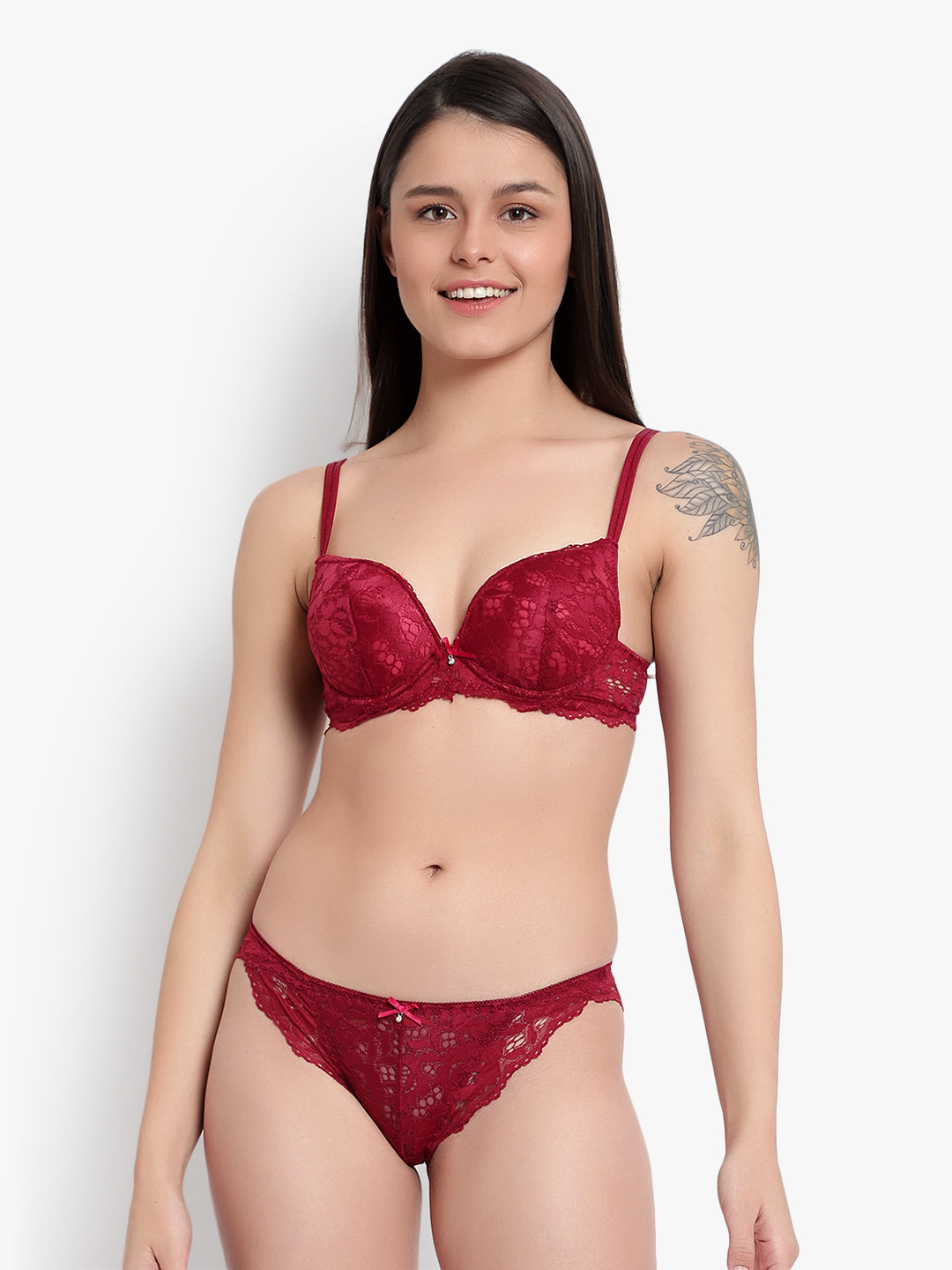 Lace Lingerie Sets with lace detail, has underwired and heavily-padded cups, adjustable straps, and double hook-and-eye closures on the back