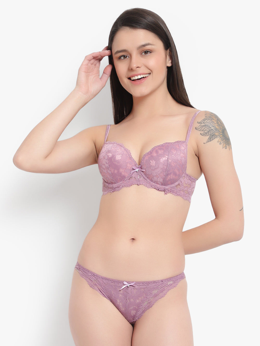 Lace Lingerie Sets with lace detail, has underwired and heavily-padded cups, adjustable straps, and double hook-and-eye closures on the back